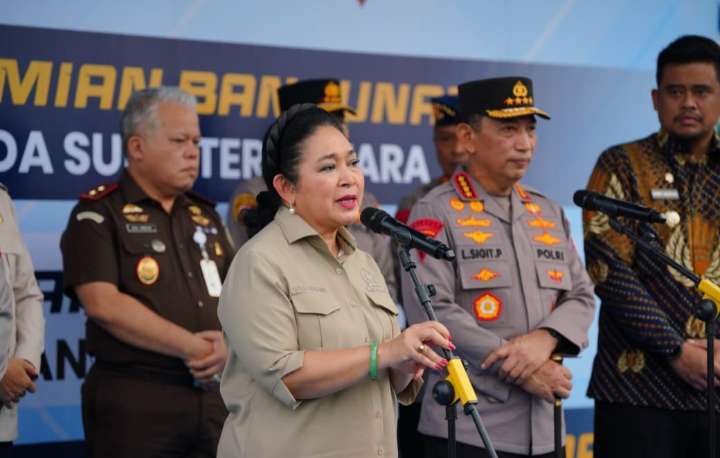 “Senang sekali hari ini saya bisa hadir di Polda Sumut memenuhi undangan pak Kapolri Jenderal Listyo Sigit Prabowo untuk sama-sama melepas bantuan untuk masyarakat yang terdampak bencana ke beberapa daerah di Sumatra,” kata Titiek di Polda Sumut, Sabtu (14/2/2026).